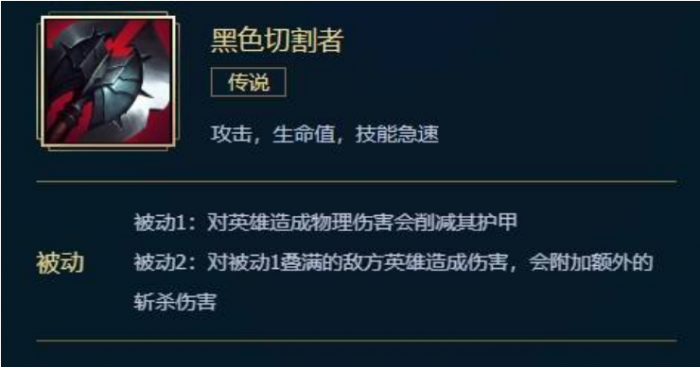 黑切这个装备可以说是诺手最为核心的装备了,这件装备可以为诺手提供生命值和攻击力还有技能急速三个属性。而且最关键的就是黑切的被动能减弱敌人的护甲,最多减弱敌人24%的护甲值。并且诺手在对敌人造成伤害的同时,可以为诺手提供20点的移速加成,如果击杀敌人则增加60点,小伙伴们在打团的时候就可以利用这件装备的加速效果,追着敌人的关键位置砍就好了。