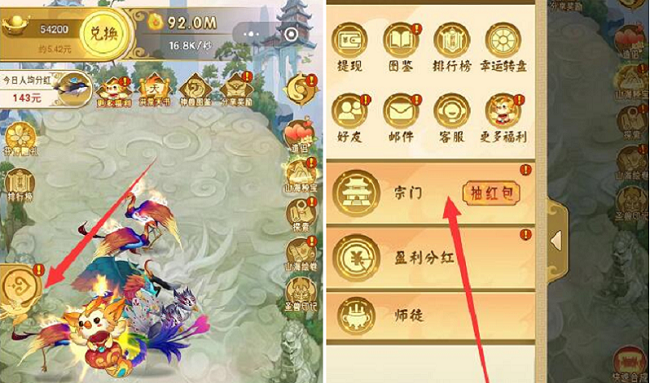 1.进入游戏首页点击下图这个图形,选择宗门点击进入。