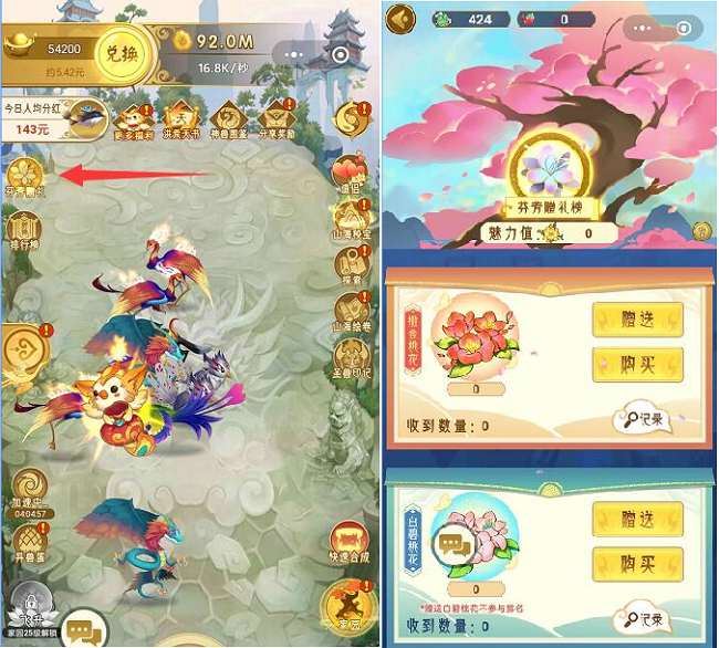 2.花数量增加,能够直接增加玩家的五彩石,一朵花增加20五彩石。而五彩石对于后期玩家非常重要,可以用来购买山海卷、天工卷,还有各种道具,如刷新、战力卡、刷新扶桑叶与异兽蛋等。