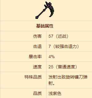 死神镰刀的攻击可以达到80,和普通的自有短柄斧差了不到15左右,挥动时发出一道旋转的紫色镰刀,可穿墙照明,到达最大距离后在原地旋转一小会儿,发出的镰刀在消失前最多可攻击6次。而且连续攻击起来的连续伤害很强,山后虐一些boss无压力啊,对于成堆的敌人更是好用,可以一次击中多个敌人,同时也没有冷却时间,甚至可以用到你毕业。