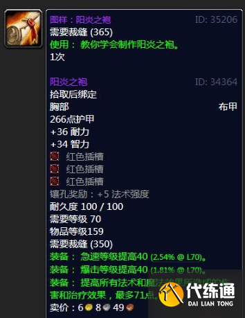 阳炎之袍:阳炎之袍图纸是不绑定的,但是做出来的装备是绑定的,所以想要拿到这件装备很多法系都选择了裁缝专业。当年刷太阳井高地小怪就掉落阳炎之袍的图纸,这图纸可以卖到1-2万金左右,在那个一张点卡还是3000金左右的年代,是一笔不少的财富了。阳炎之袍属于终极毕业装备,土豪玩家是一定会买的,普通玩家穿个t6衣服也是挺香的。