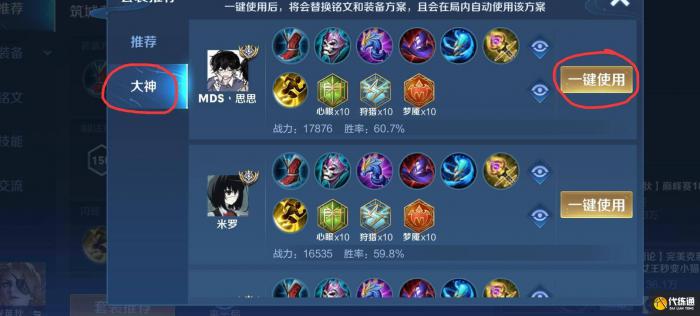 3,点击大神出装,查看后一键使用即可。