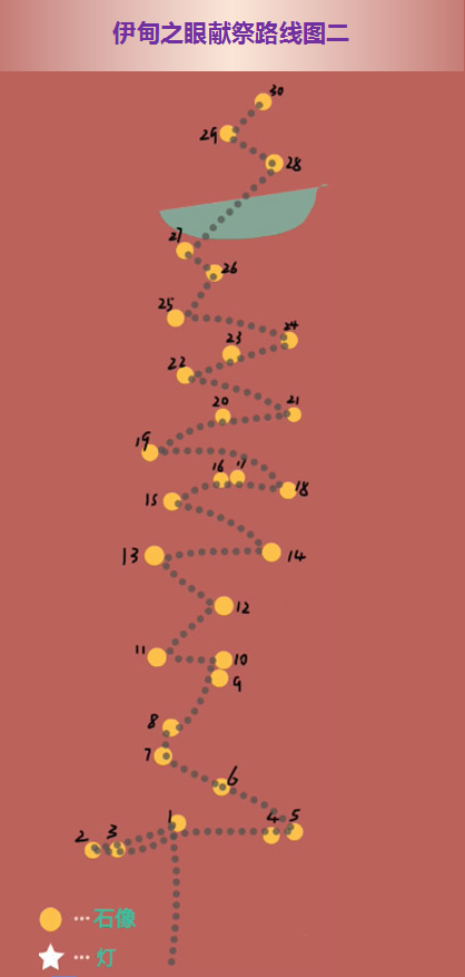 一路上尽可能多的献祭(点先祖)依靠石灯补充能量,躲避飞石,准时机走到先祖身边即可。这部分主要分为两个阶段,下面为大家分享路线图: