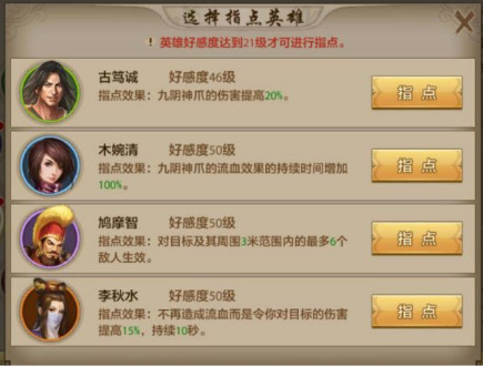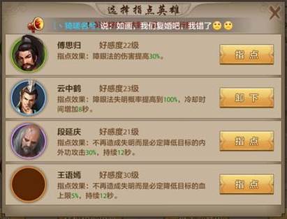 5.障眼法真武指点:很好选,云中鹤的指点不仅百分百的控制,而且还多了一个必中,所以一定是选他。