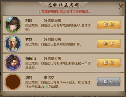 7.月落西山技能指点:指点选择玄慈,可以让少侠的月落西山失明效果增加1秒的失明效果。