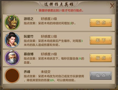 8.呆若木鸡技能指点:如果对外功门派建议使用阮星竹,因为对方攻击你的时候是贴着你打,阮星竹的指点效果就显而易见了。要是内功门派建议你使用慕容复,每秒恢复2%,8秒时间可以恢复很多的血量。