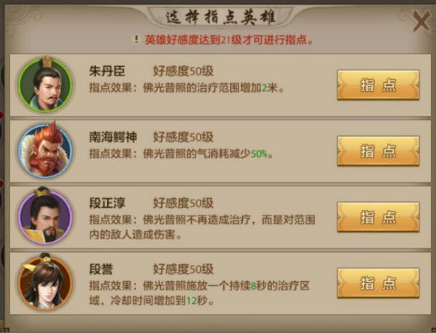 6.佛光普照技能指点:在平时只能用段誉,因为佛光的本身是一个引导性技能,但是段誉的指点将该技能变成了一个瞬发技能。