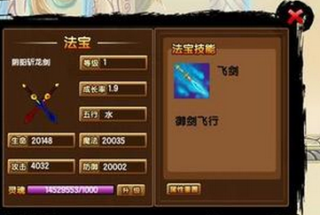 在造梦西游3里,阴阳斩龙剑这样的法宝并不多见,甚至有些童鞋还将其和青龙剑对比。想要获得它,可以通过挑战八仙过海副本的BOSS魔吕洞宾获取哦!它的技能不仅仅是御剑飞行,还能回HP和MP,同时还有攻击技能御剑斩,还是蛮稀有的。阴阳斩龙剑每增加0.1的成长率,就可以带来魔法7点,生命7点,攻击1点,对于属性增长而言还是可以的。而在选择属性上,小编建议最好是金双,能加攻击。如果是金火也不错,可以增加生命。至于其他合并属性,并不是很推荐。