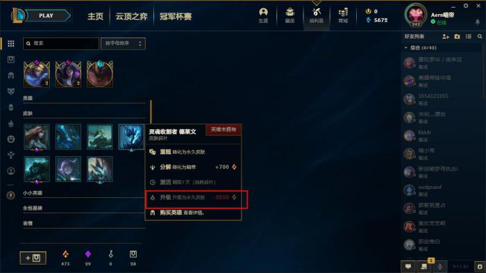 2,选择一个合适的皮肤碎片,右键鼠标点击,升级为永久皮肤,在弹出的窗口中点击升级即可。