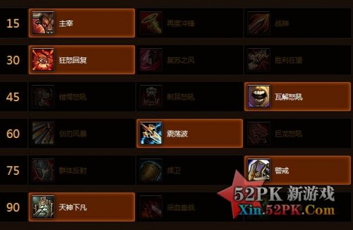 全新战士天赋分为6层:第一层天赋15级,强化[冲锋]效果,第二层天赋30级,自我恢复效果,第三层天赋45级,AoE控场技能,定身、诱捕或打断,第四层天赋60级,AoE伤害技能,第四层天赋60级,AoE伤害技能,第六层天赋90级,终极伤害技能。