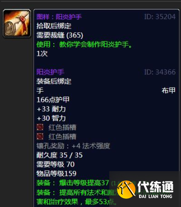 阳炎护手:大名鼎鼎的阳炎护手图纸掉落于太阳井高地,法系tbc版本毕业没有之一,53点法伤加2个红宝石槽,堪称完美,唯一美中不足的就是价钱太贵了,属于早买早毕业的装备。