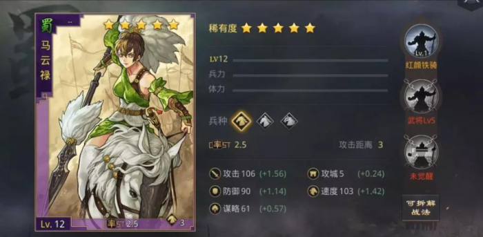 马云禄是一名女性武将,攻击成长为1.56,还算不错,其被动战法为红颜铁骑,效果是每个回合可以进行两次普攻。短板的地方在于谋略成长比低。